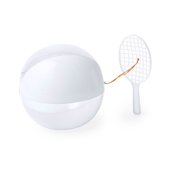 Fun-Set aus Schläger und Ball in einer Kombination aus weißen und transparenten Farben, durch ein Gummiband befestigt. Mit Aufblasventil und präsentiert in einer recycelten Tasche.