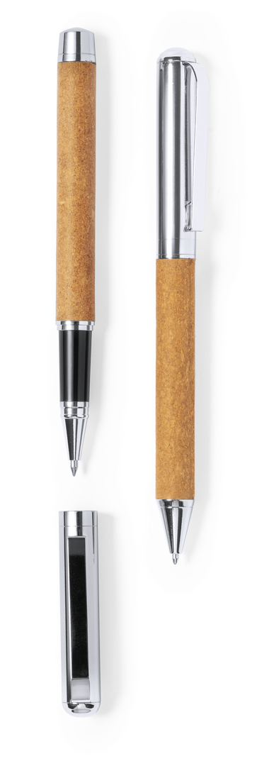 Set aus Metallkugelschreiber und Roller, mit einem Gehäuse aus recyceltem Leder. Enthält:Kugelschreiber aus verchromtem Metall mit einem Gehäuse aus recyceltem Leder. Eleganter Metallclip und passendes Zubehör, Drehmechanismus und blauschreibende Tinte. Mit dem unverwechselbaren Logo für recyceltes Leder auf dem Schaft.Roller aus verchromtem Metall mit einem Gehäuse aus recyceltem Leder. Eleganter Metallclip und passendes Zubehör, Kappe und blauschreibende Tinte. Mit dem unverwechselbaren Logo für recyceltes Leder auf dem Schaft.Recyceltes Leder gewinnt die Fasern zurück, die bei der Herstellung von Leder weggeworfen werden, minimiert die Materialverschwendung, trägt zur Reduzierung der Umweltbelastung bei und bewahrt gleichzeitig die ursprünglichen Eigenschaften des Leders.