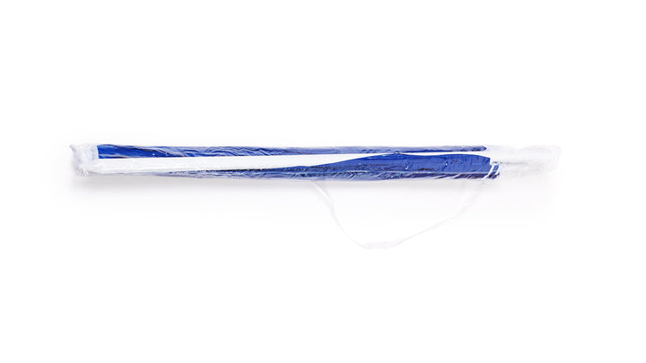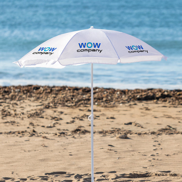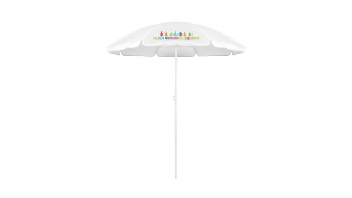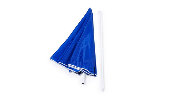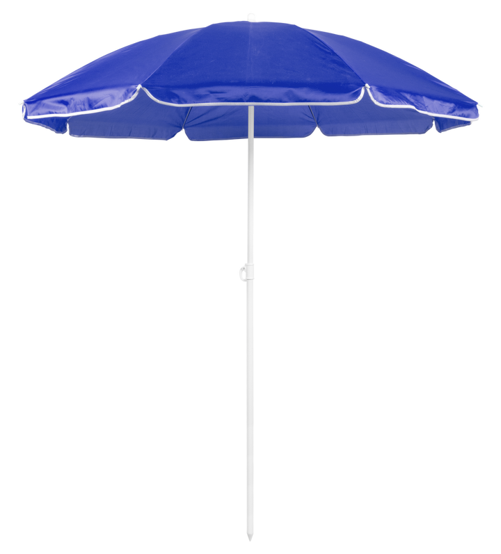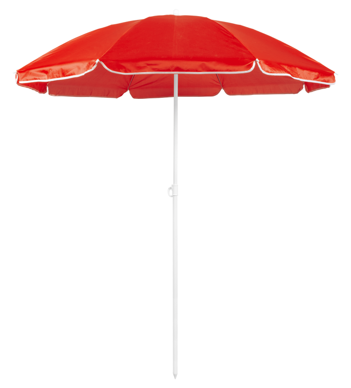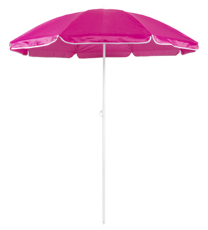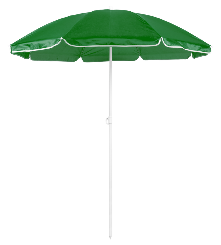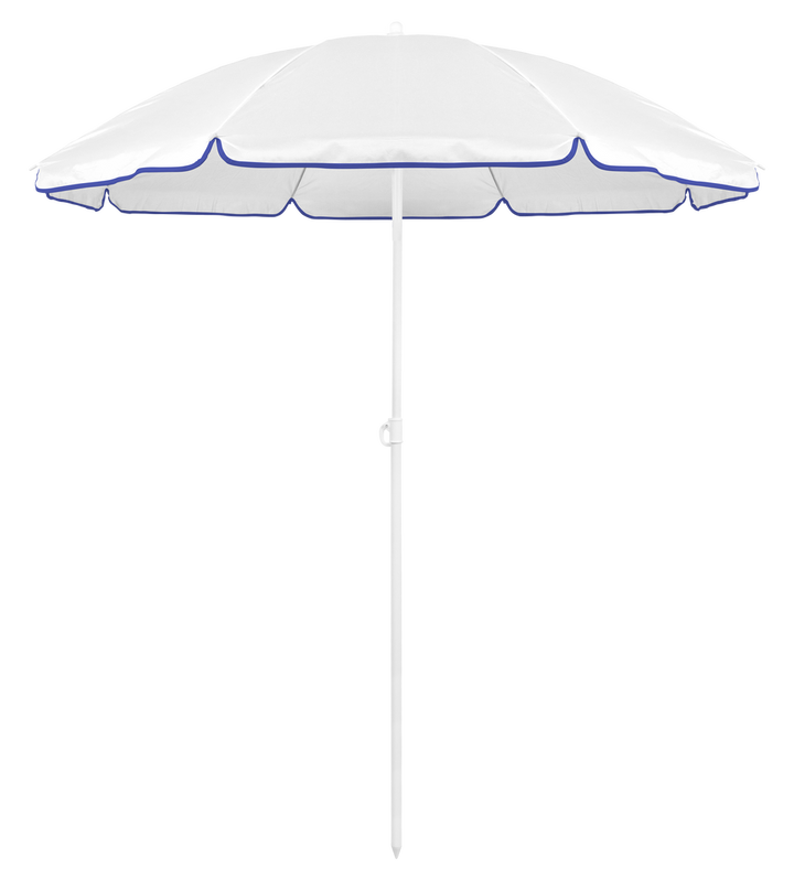 Sonnenschirm mit 8 Panelen aus robustem Nylon in verschiedenen lebendigen Farben. Mit einem Durchmesser von 150 cm, Paspelierung an den Rändern und höhenverstellbaren Metallrohren in Weiß. Präsentiert in einer PVC-Hülle mit Schultergurt.