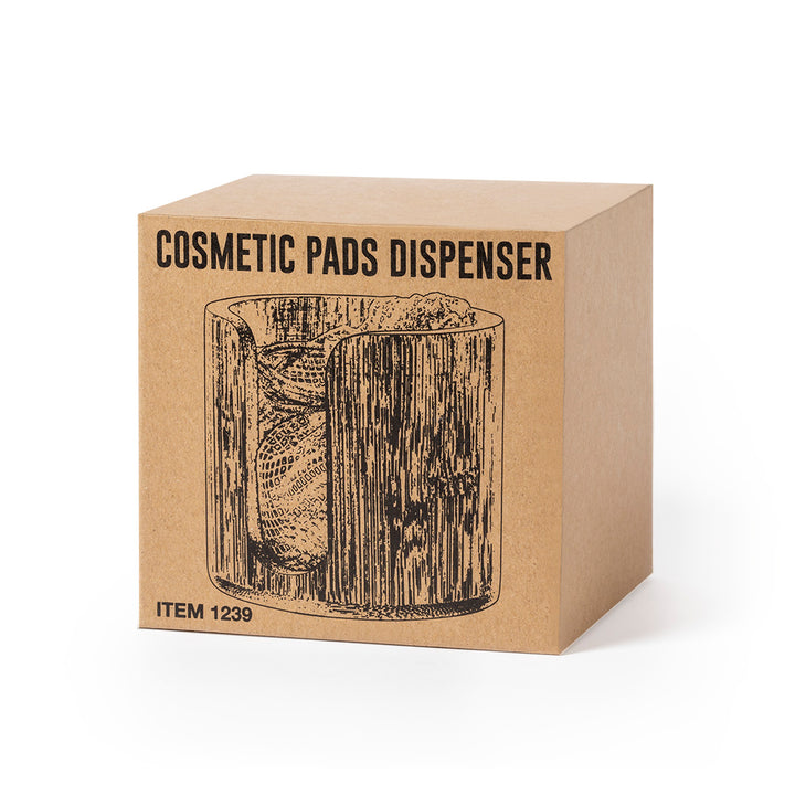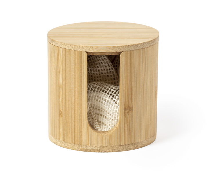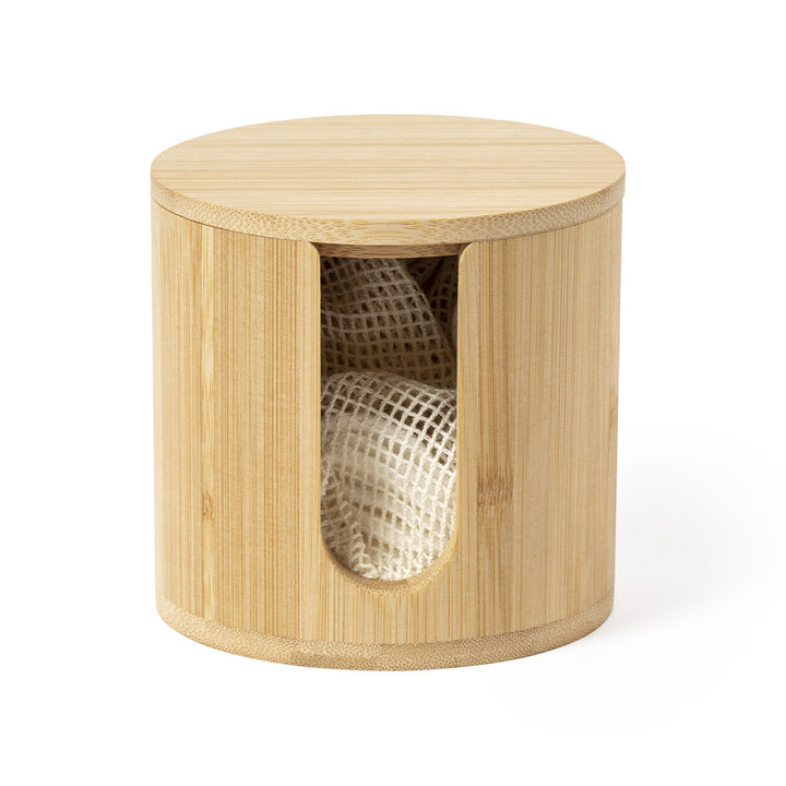 Linie "Natur" Make-up-Entferner-Tuchspender. Hergestellt aus Bambus, um die Verwendung von natürlichen Rohstoffen zu fördern. Mit 10 wiederverwendbaren Baumwollpads und einem Waschbeutel. Präsentiert in einer individuellen, ökologisch gestalteten Schachtel.