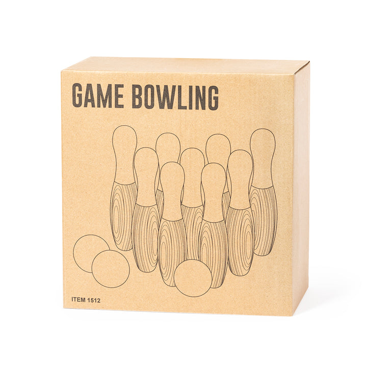 Juego de bolos fabricados en resistente madera natural de pino, con parte superior de cada bolo lacada en blanco. Set de 9 bolos y 3 bolas de color blanco, en bolsa de transporte 100% algodón, con cordón de cierre a juego. Presentación en caja individual de diseño kraft, con manual de instrucciones en español e inglés.