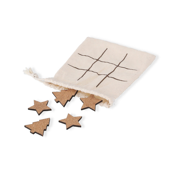 Tic-tac-toe-Spiel aus Naturkork. Inklusive 5 baumförmigen Spielsteinen und 5 sternförmigen Spielsteinen. Präsentiert in einem Baumwollbeutel mit Kordelzug, der als Spielbrett verwendet wird.Hergestellt aus pflanzlichen Elementen zur Förderung der Nutzung natürlicher Rohstoffe und zur Reduzierung der Schadstoffemissionen.