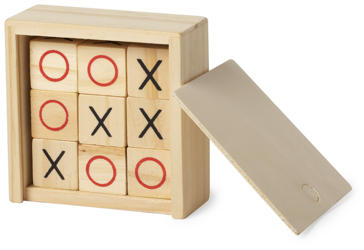 Brettspiel aus Holzmaterial, präsentiert in einer individuellen Holzkiste mit Schiebedeckel.