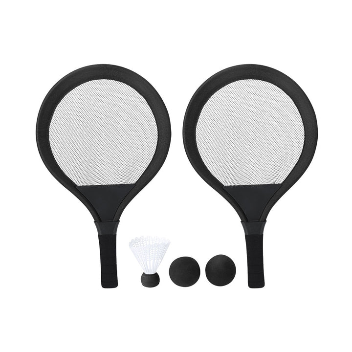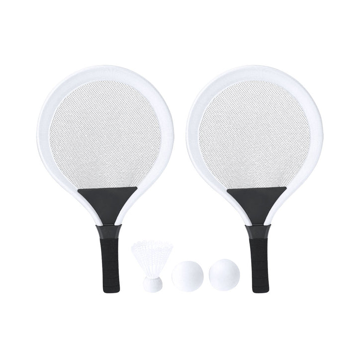 Set mit Schlägern. Enthält:- 2 Schläger mit ergonomischem Griff und gepolsterten Kanten, für einen bequemen und sicheren Halt während des Spiels.- 2 passende Bälle aus EVA-Material.- 1 Feder.Ideal für den Einsatz im Freien, sei es am Strand, im Park oder im Garten.
