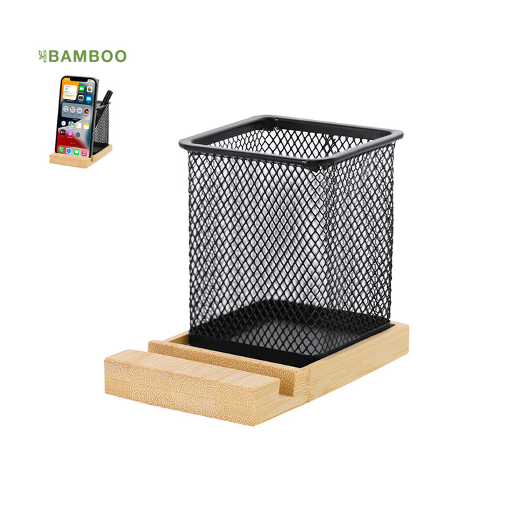 Stift aus Metallgitter mit natürlichem Bambusboden. Mit praktischem integriertem Halter für Smartphones entworfen.Materialien wie Bambus fördern die Verwendung natürlicher Rohstoffe und reduzieren die Schadstoffemissionen. Außerdem stammt der Bambus von einer sehr widerstandsfähigen und vielseitigen Pflanze, die schnell wächst und regeneriert, was ihn zu einer hervorragenden Alternative zur herkömmlichen Holzverwendung macht.
