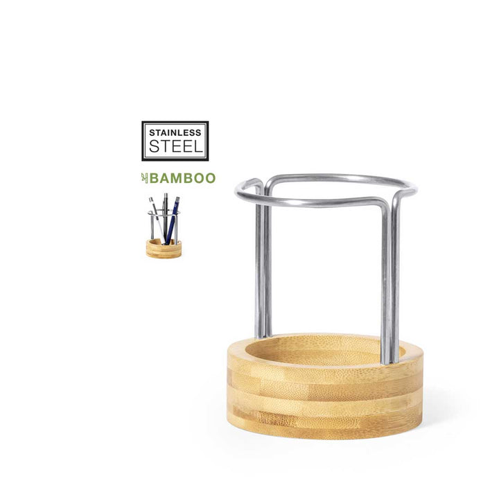 Der Stifthalter Oswin überzeugt durch sein einzigartiges Design und die Verwendung von natürlichen Materialien. Gefertigt aus edlem Bambus und rostfreiem Edelstahl, bietet er eine stilvolle Möglichkeit, Stifte und Bleistifte übersichtlich zu organisieren. Mit einem Durchmesser von 8,6 cm und einer Höhe von 10,3 cm ist er sowohl praktisch als auch dekorativ und fügt sich harmonisch in jede Umgebung ein.