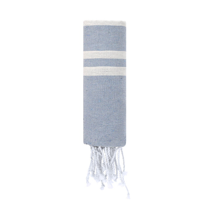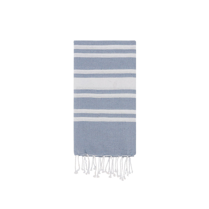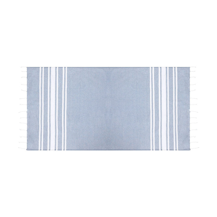 Weicher Pareo-Handtuch von 150 g/m2 in einer Kombination aus Baumwolle und Polyester. Sein Design hat einen bunten Hintergrund mit weißen Streifen. Enthält Fransen an den Enden, die ein dekoratives Detail hinzufügen und den Abschluss vervollständigen.