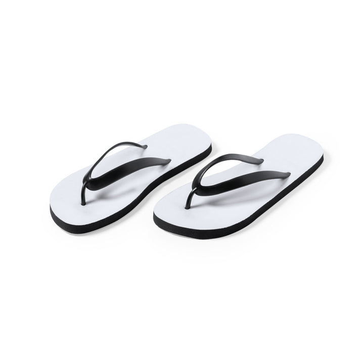 Paar Flip-Flops mit 100 % anpassbarer Sohle und speziell für den Sublimationsdruck konzipiert. Mit widerstandsfähiger EVA-Sohle, schwarzen PVC-Riemen und in zwei Größen erhältlich: 36-38 und 42-44. Set inklusive gestanztem EVA-Panel zur individuellen Gestaltung.
