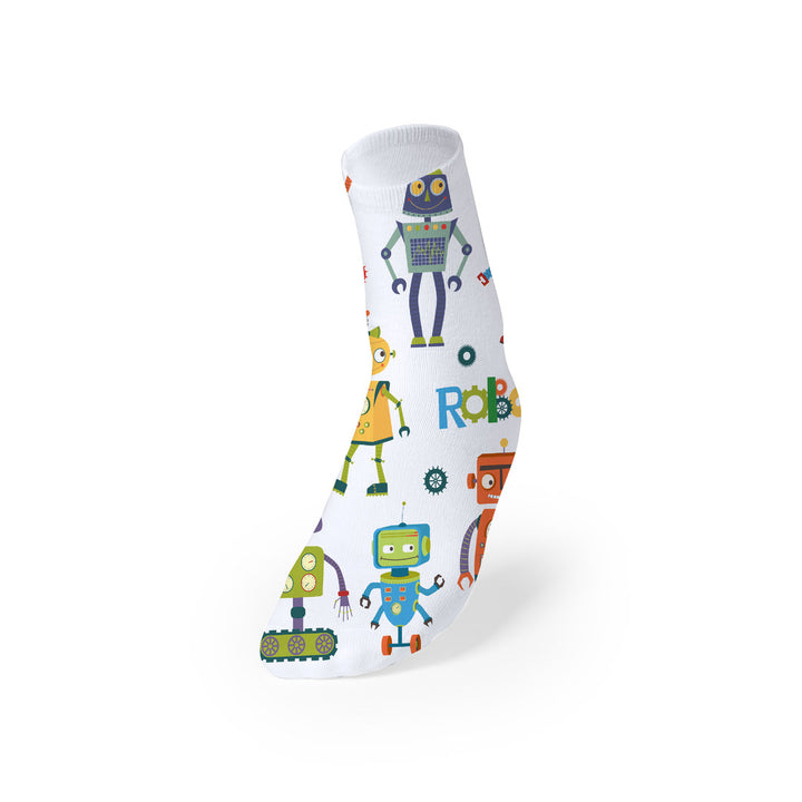 Ein Paar Socken aus weißem Polyester, speziell für den Sublimationsdruck entwickelt. In Größe S-M.