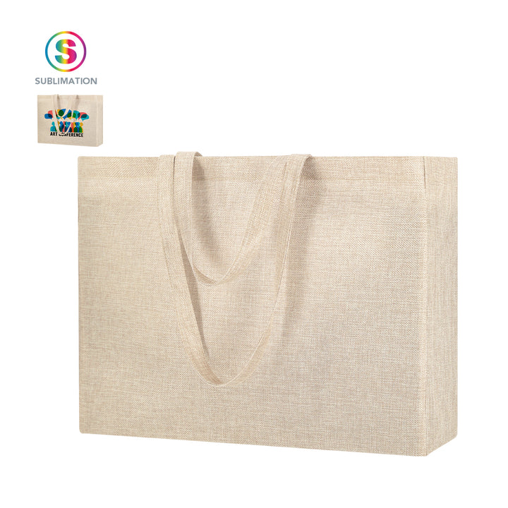 Tasche aus weichem und strapazierfähigem Polyester, ideal für die Personalisierung durch Sublimationsdruck. Mit Falten und verstärkten langen Trageriemen. Widerstand bis 8 kg Gewicht.