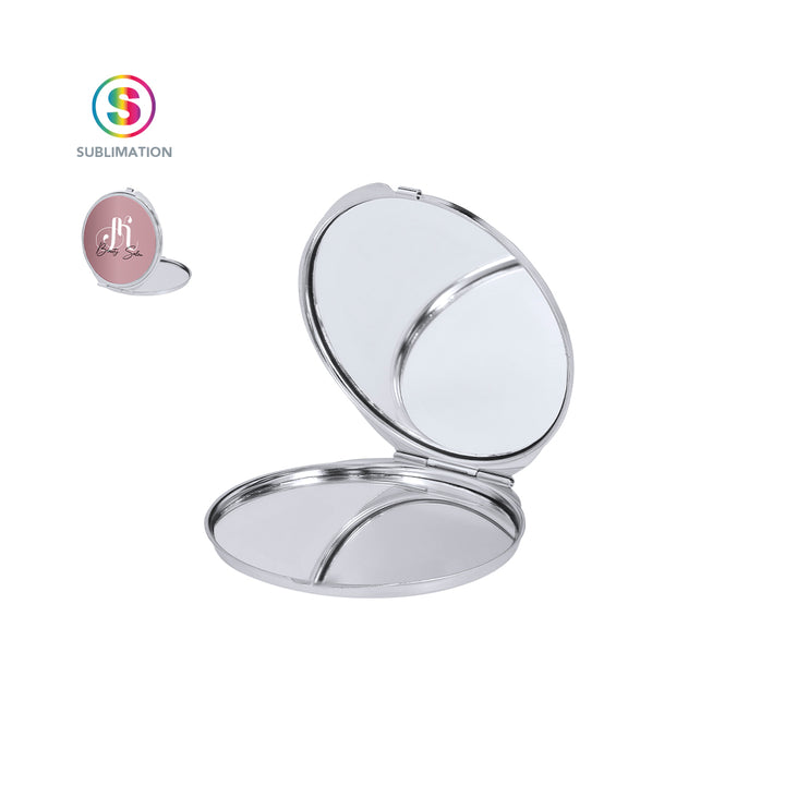Faltbarer metallischer Spiegel mit Sublimationsfläche (nicht im Produkt integriert, ideal zum Drucken und späteren Aufkleben). Mit zwei Innenspiegeln: 1X und 2X-Vergrößerung.