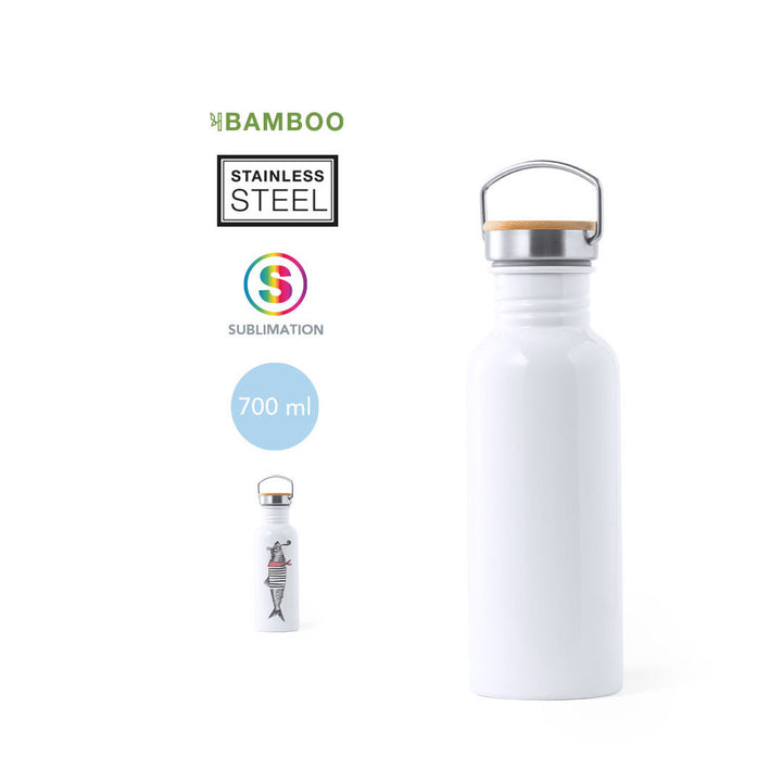 Gefertigt aus robustem Edelstahl und veredelt mit Bambuselementen, überzeugt die Flasche durch ihre langlebige Qualität und ansprechende Optik. Der schraubbare Deckel aus Edelstahl, ergänzt durch ein stilvolles Bambusdetail, gewährleistet einen sicheren Verschluss, während der praktische Vintage-Tragegriff den Transport besonders komfortabel macht.