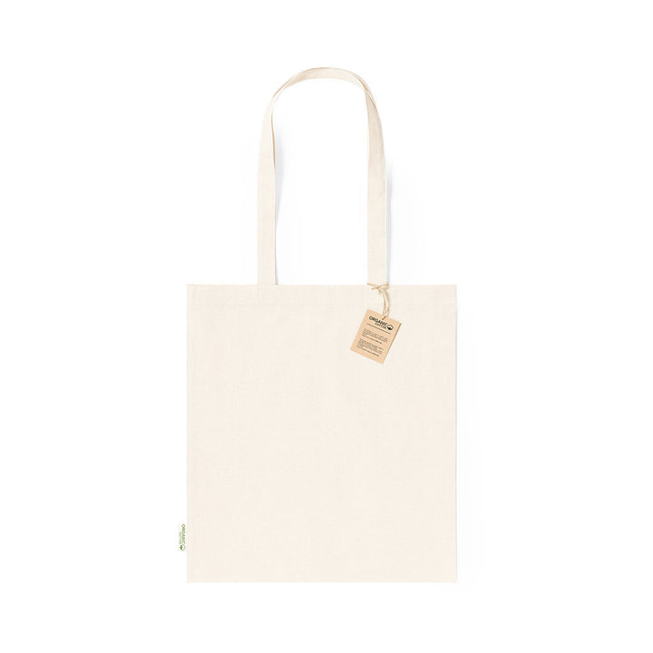 Tasche aus 100% Bio-Baumwolle 180g/m2 und in Naturtönen. Genähtes Ausführung mit 70 cm langen, verstärkten, mittleren Griffen. Widerstandsfähigkeit bis zu 8 kg, einschließlich Bio-Baumwolle Etikett und Hangtag aus recyceltem Karton.