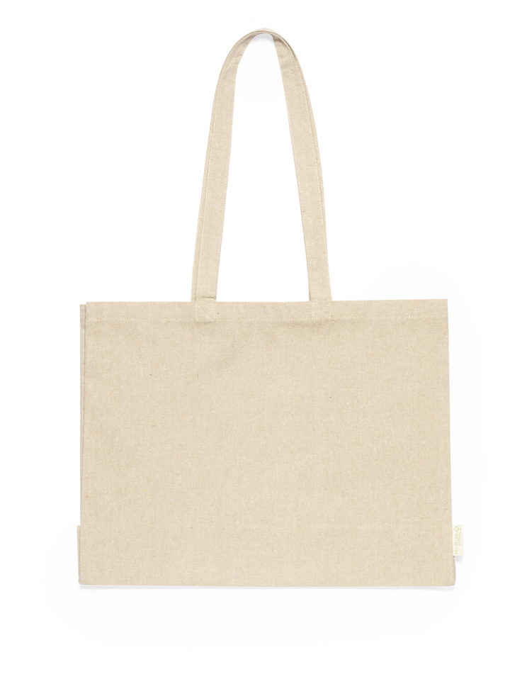 Natur Linie Tasche aus recycelter Baumwolle mit hoher Dichte (240g/m2). Abgenäht und mit langen, verstärkten Griffen (70 x 2,5 cm). Mit Zwickel und in den Farben Natur und Schwarz erhältlich, mit Etikett aus recycelter Baumwolle auf der Außenseite. Belastbar bis zu einem Gewicht von 10 kg.GRS-Zertifizierung (Global Recycled Standard) verfügbar, die die recycelte Herkunft des für die Herstellung des Produkts verwendeten Materials garantiert.