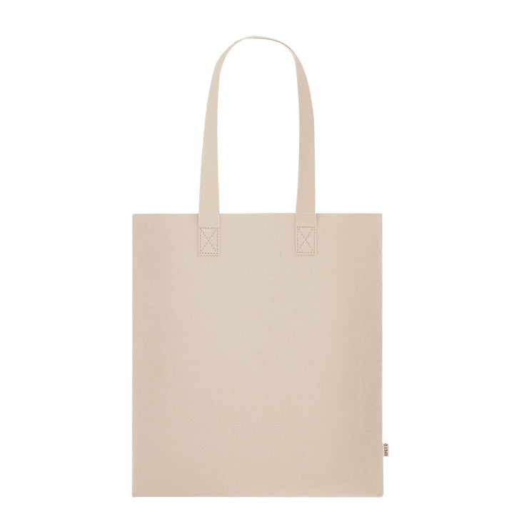 Tasche aus recyceltem RPET-Filz. Mit langen verstärkten Tragriemen. Tragfähigkeit bis zu 6kg. Enthält das RPET-Merkmal auf dem äußeren Etikett.Das RPET-Material wird aus recyceltem Kunststoff hergestellt, um die Wiederverwendung von Kunststoffabfällen zu fördern und zur Nachhaltigkeit des Planeten beizutragen.