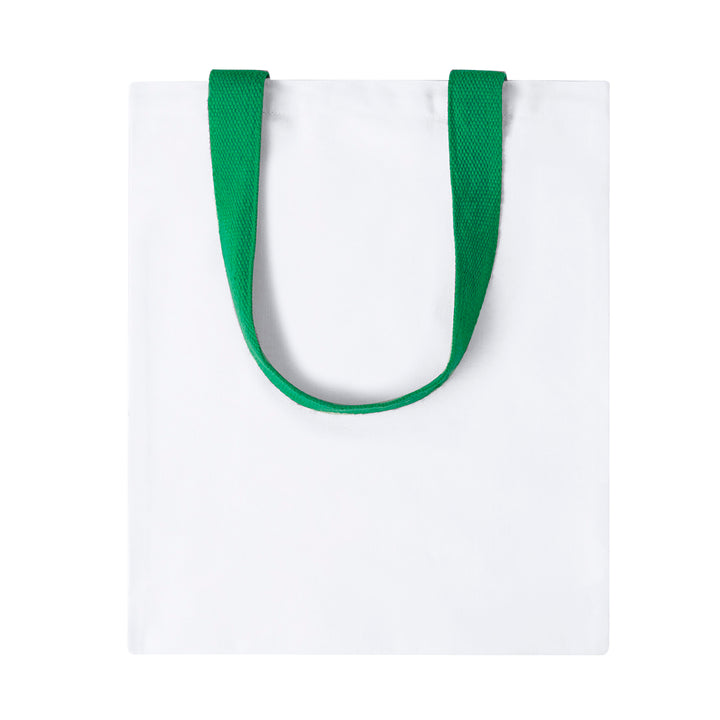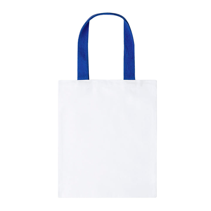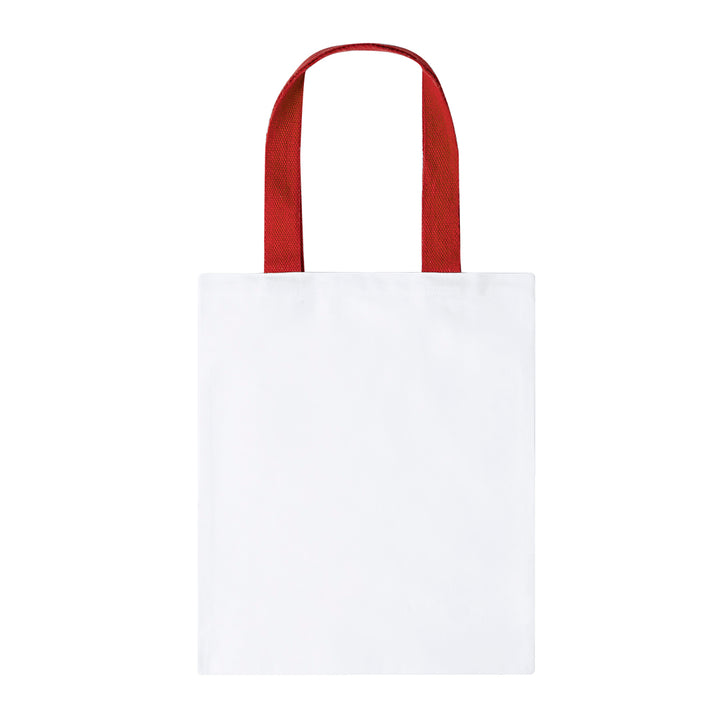 Segeltuchtasche 230g/m2. In weißer Farbe, mit widerstandsfähigen Nähten und verstärkten Griffen in verschiedenen Farben, 60 cm lang.