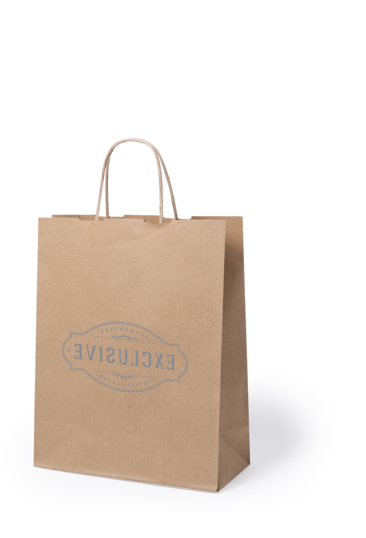 Tüte aus Papier (100 g/m2) in Naturfarbe mit kurzen, verstärkten Griffen und Zwickel. Belastbar mit bis zu 7 kg.
