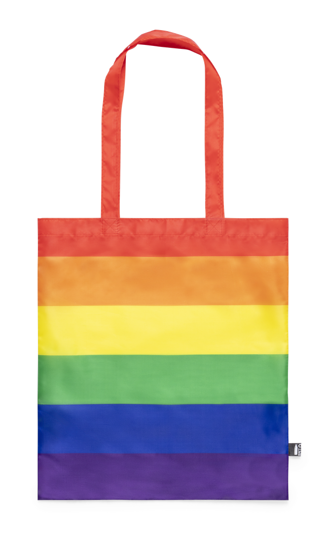 Mehrfarbige Rainbow-Tasche, hergestellt aus RPET 210T. Mit genähter Oberfläche und langen verstärkten Griffen (70 x 2,5 cm). Eine Tasche, auf die man stolz sein kann, mit einem Außenetikett mit dem unverwechselbaren RPET.Das RPET-Material wird aus recyceltem Kunststoff hergestellt, um die Wiederverwendung von Kunststoffabfällen zu fördern und die Nachhaltigkeit unseres Planeten zu unterstützen.