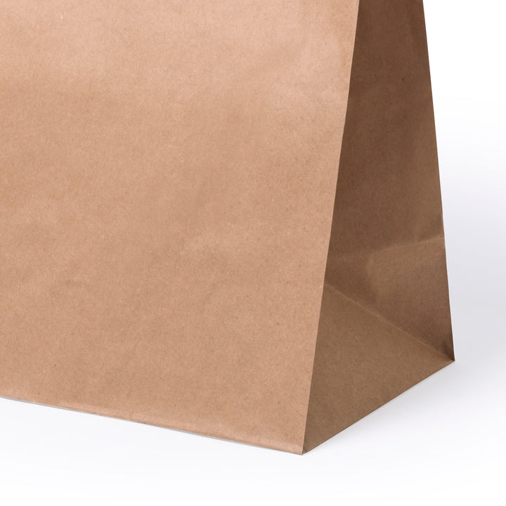 Tüte aus Papier (80 g/m2) in Naturfarbe mit kurzen, verstärkten Griffen und Zwickel. Belastbar mit bis zu 5 kg.