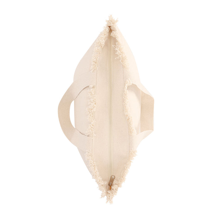 Tasche im Fransen-Stil, hauptsächlich aus 320 g/m2 Baumwolle gefertigt. Mit praktischem und modernem Design, beinhaltet verstärkte lange Griffe. Enthält einen Reißverschluss für zusätzliche Sicherheit.