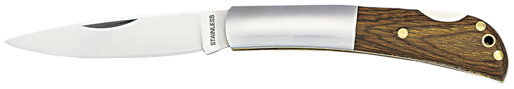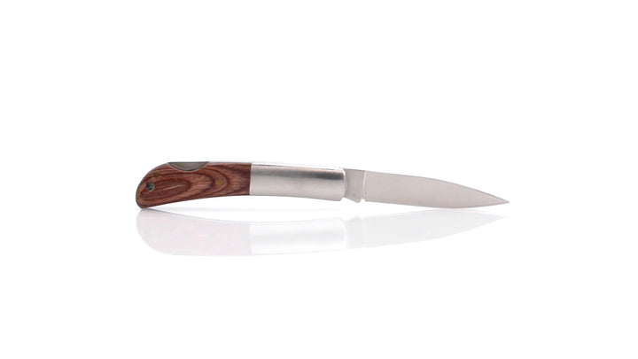Taschenmesser mit Klinge aus Edelstahl und Griff aus einer Kombination von Naturholz und Edelstahl. Mit Sicherheitsverschluss und Stanzung am Griff. Präsentiert in einer individuellen Box.