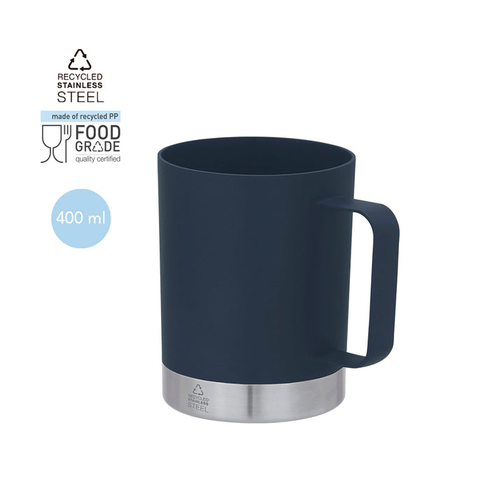 Tasse aus recyceltem PP, kombiniert mit einer Basis aus recyceltem Edelstahl. Mit 400 ml Fassungsvermögen.Mit Lebensmittelsicherheitszertifizierung, um die Sicherheit zu gewährleisten, wenn Lebensmittel mit dem Material in Kontakt kommen, das für die Herstellung des Produkts verwendet wird. Mit Kennzeichnung für recycelten Edelstahl.Recyceltes PP ist ein recycelter und hochgradig recycelbarer Kunststoff mit großer Festigkeit und für zahlreiche Anwendungen geeignet.Edelstahl ist eines der gefragtesten Materialien und kann fast überall gefunden werden, von Alltagsprodukten bis hin zu großen Konstruktionen. Mit unzähligen Eigenschaften, darunter Haltbarkeit und hohe Wiederverwendbarkeit, ist es eine sehr geschätzte Alternative in Nachhaltigkeitslösungen. Richtig verarbeitet, ermöglicht es die Gewinnung neuer Ressourcen von unendlicher Nutzung.