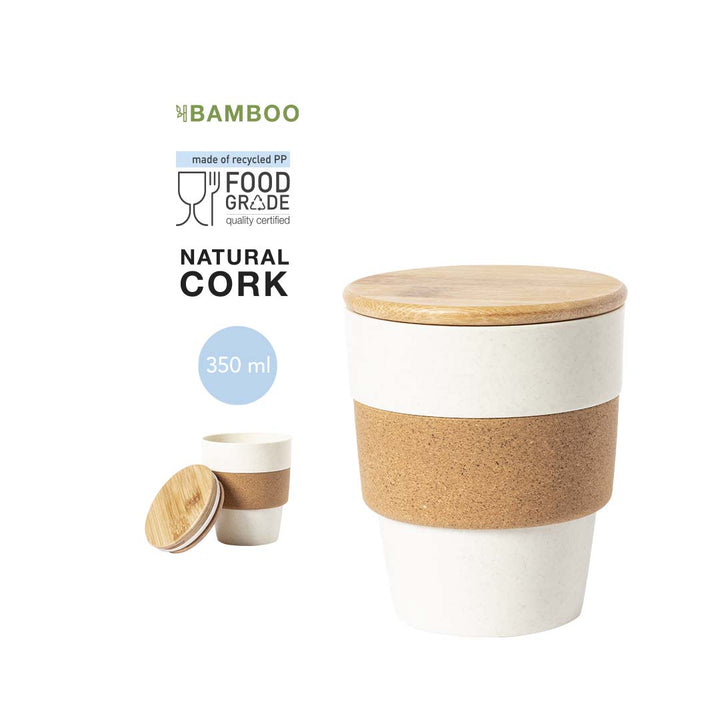 Gefertigt aus geädertem PP, bietet der Becher eine robuste und langlebige Struktur, die gleichzeitig eine natürliche Ästhetik und angenehme Haptik bietet. Das Außenband aus Naturkork sorgt für einen besonders komfortablen Halt und setzt einen stilvollen Akzent. Der Deckel aus Bambus ist nicht nur funktional, sondern auch ein umweltbewusster Bestandteil des Designs.