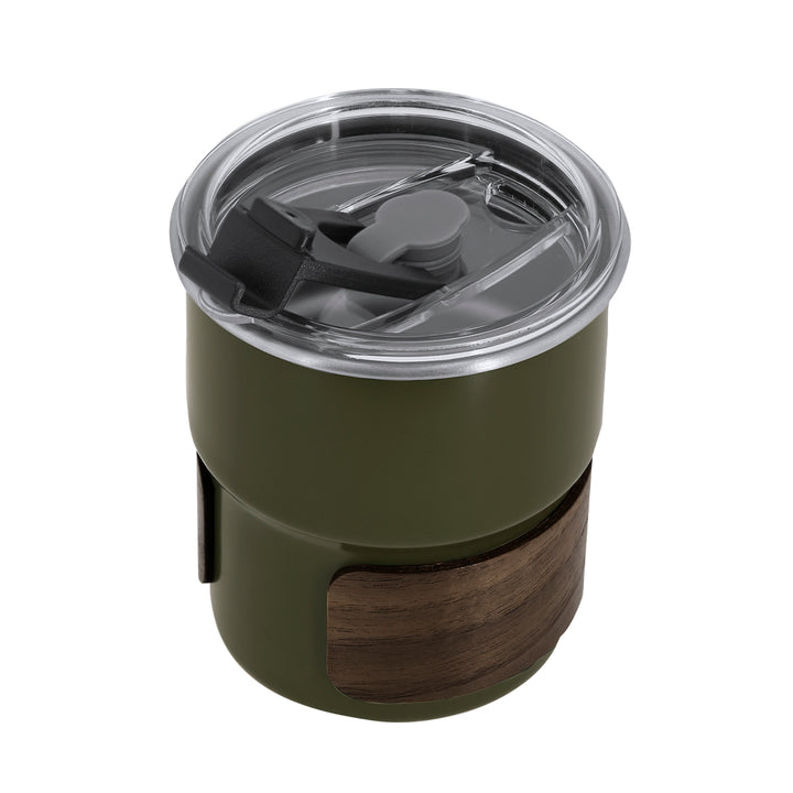 Becher aus rostfreiem Stahl und edlem Holz. Mit 250 ml Fassungsvermögen. Enthält elegantes Holzband. Enthält einen hermetischen transparenten Deckel mit Dosierer in der Abdeckung und einem Loch für Strohhalme, BPA-frei.