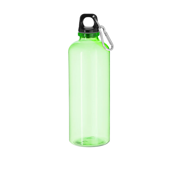 Flasche aus strapazierfähigem RPET mit einer Kapazität von 630 ml. Translucenter Körper und schwarzer Schraubverschluss für eine optimale Abdichtung. Mit einem Metallkarabiner, der den Transport erleichtert. BPA-frei.Das RPET-Material wird aus recyceltem Kunststoff hergestellt, um die Wiederverwendung von Kunststoffabfällen zu fördern und zur Nachhaltigkeit des Planeten beizutragen.