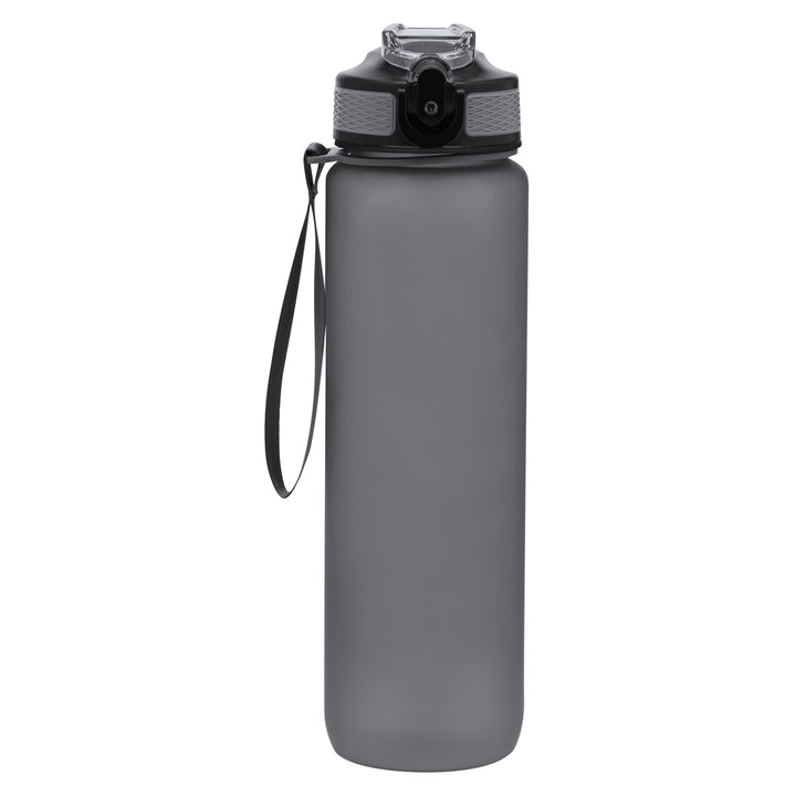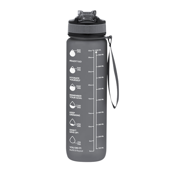Flasche mit einer Kapazität von 1L, hergestellt aus langlebigem PETG, mit einer matten, durchscheinenden Oberfläche. Mit Kapazitätsanzeige in Litern und Unzen sowie motivierenden Sprüchen, die zum richtigen Hydrieren einladen. Mit schwarzem Schraubverschluss. Inklusive eines Spenders mit Sicherheitsverschluss und einem bequemen Trageriemen. BPA-frei.