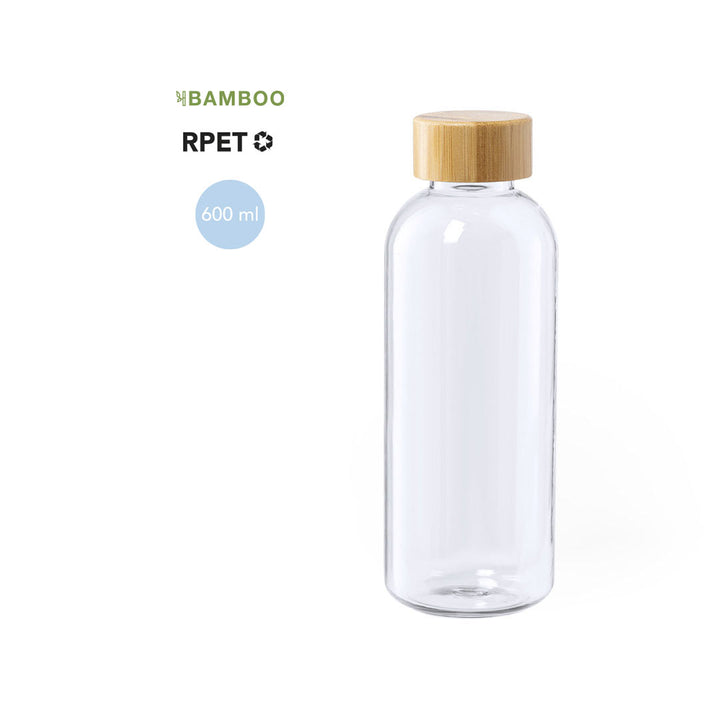 Gefertigt aus RPET, einem recycelten Kunststoff, trägt die Flasche zur Reduzierung von Plastikmüll bei und ist gleichzeitig BPA-frei, was sie gesundheitlich unbedenklich macht. Der natürliche Bambus-Schraubverschluss verleiht der Flasche eine edle und umweltbewusste Optik.