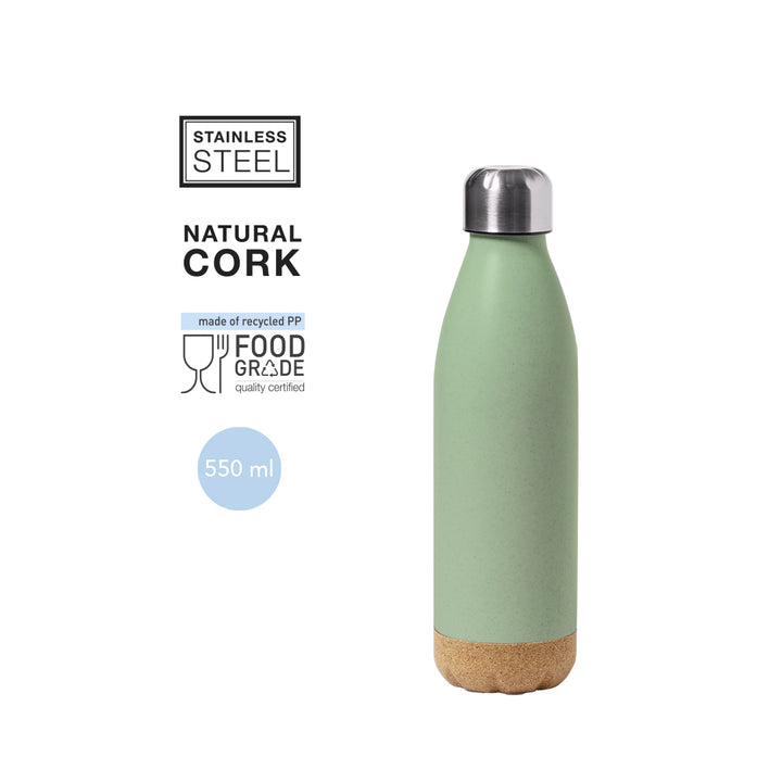 Dank der Kombination aus PE, Kork und Edelstahl ist die Flasche besonders langlebig und robust. Sie eignet sich perfekt für alle, die eine umweltbewusste und funktionale Lösung suchen, die ihren Alltag bereichert.
