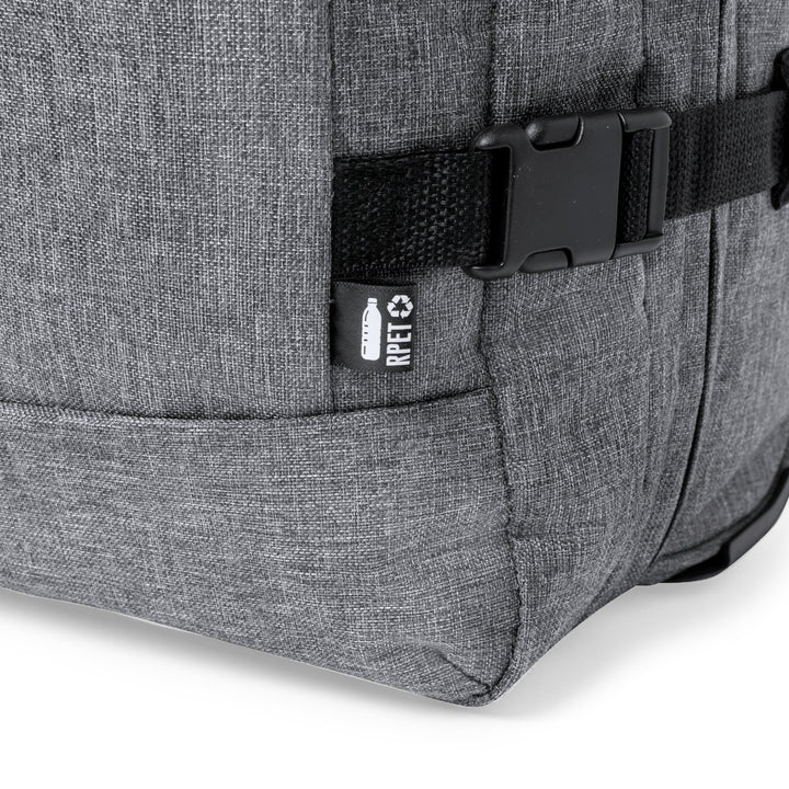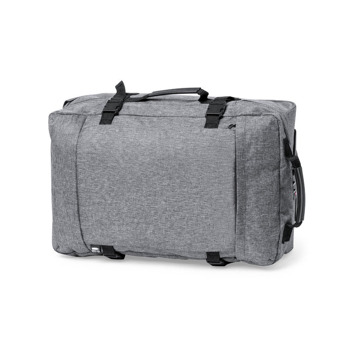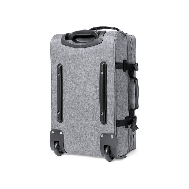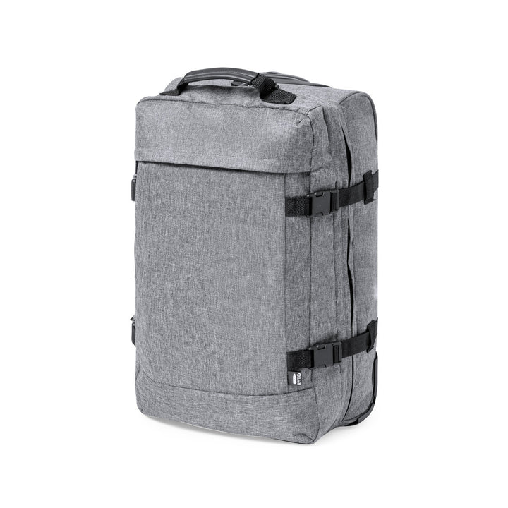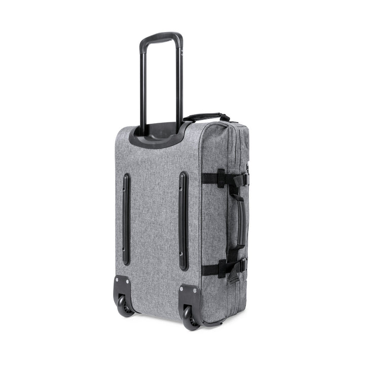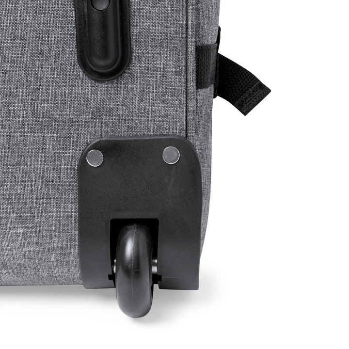 Linie Natur Trolley aus strapazierfähigem 300D RPET. Hauptfach mit Doppelreißverschluss nach TSA-Standard (Transportation Security Administration), der es den Zollbehörden ermöglicht, den Inhalt des Gepäcks zu kontrollieren, ohne den Verschluss gewaltsam öffnen zu müssen, und zwar mit einem speziellen Schlüssel, der den Behörden zur Verfügung steht.Gefütterter Innenraum mit elastischen Verschlussbändern. Außenseite mit 2 verstellbaren Riemen, Schnallenverschlüssen, Vordertasche mit unsichtbarem Reißverschluss und 2 gepolsterten Tragegriffen. Schwarzer Metall-Ausziehmechanismus mit bequemem Tragegriff und 2 Rädern. RPET-Emblem auf dem Außenetikett.