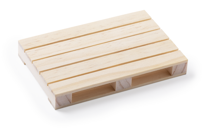 Original posavasos de línea nature con forma de palet y en madera natural.