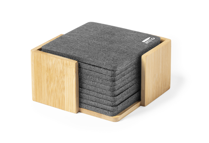 Set de 10 posavasos de línea nature. Fabricados en fieltro RPET reciclado, fruto de la combinación del proceso de reciclaje de materiales plásticos junto con la técnica milenaria de fabricación del fieltro, dando como resultado un material de eco-tendencia que, además de ser de origen reciclado, también se convierte en reciclable. Soporte fabricado en bambú y posavasos con distintivo RPET. Set presentado en caja individual de diseño kraft.
