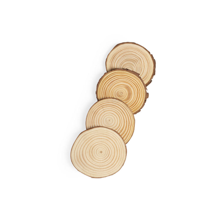 Untersetzer aus natürlichem Kieferholz. 4 Stücke von etwa 1 cm Dicke. Naturschnitt, mit Untersetzerdurchmesser von ca. 8-10 cm, inklusive Schnur aus natürlichem Jute-Material.