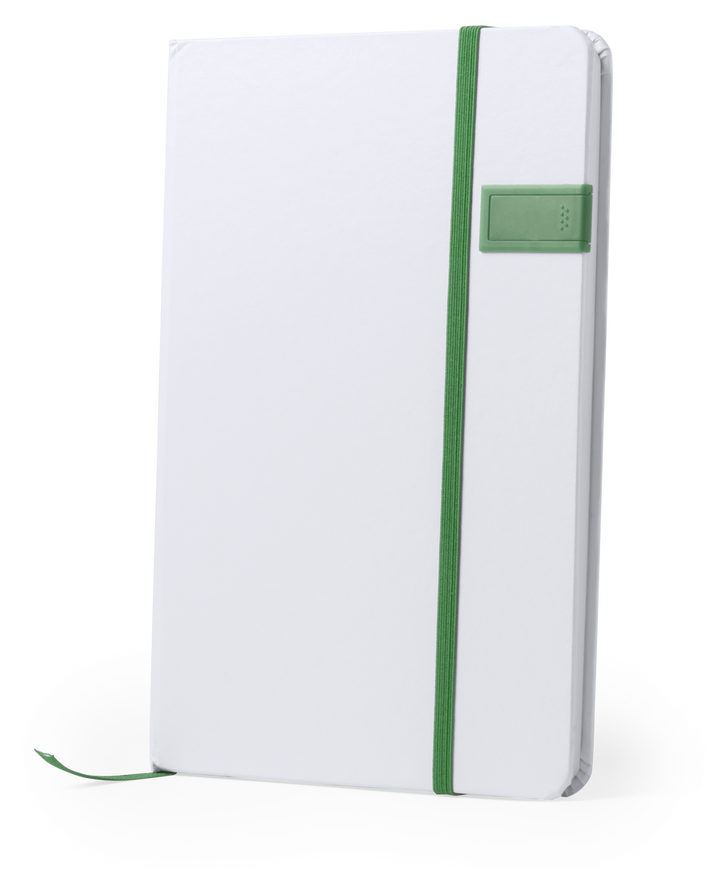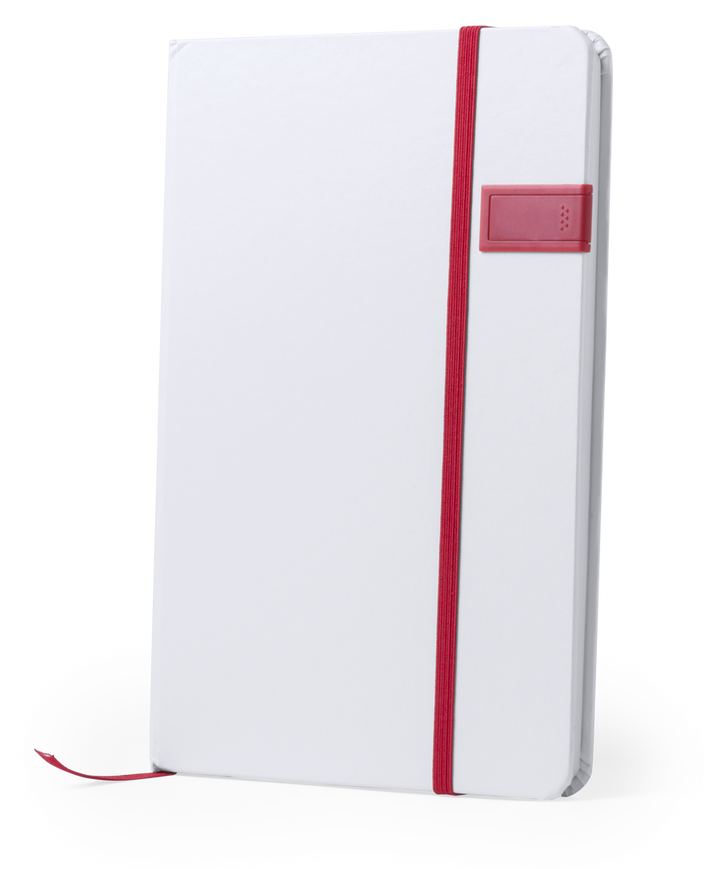 Notizblock mit coolem Design in Weiß. Mit im Cover integriertem USB-Speicher von 16 GB, Gummibandverschluss und Lesezeichenband in passender Farbe. Mit 100 linierten Blättern. Erhältlich in verschiedenen lebendigen Farben.