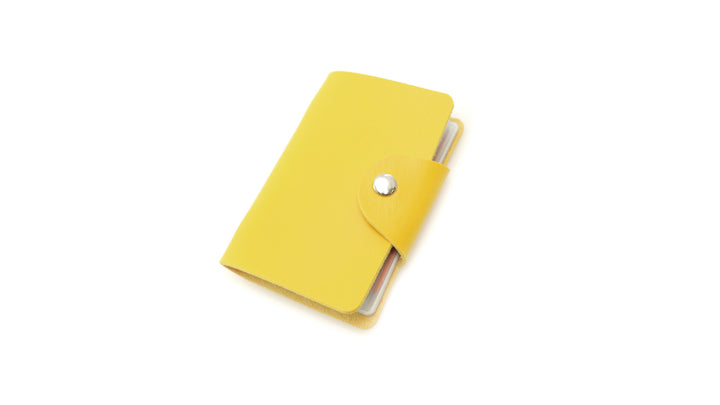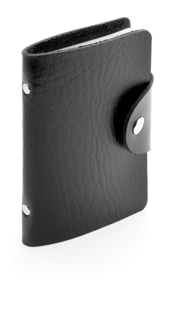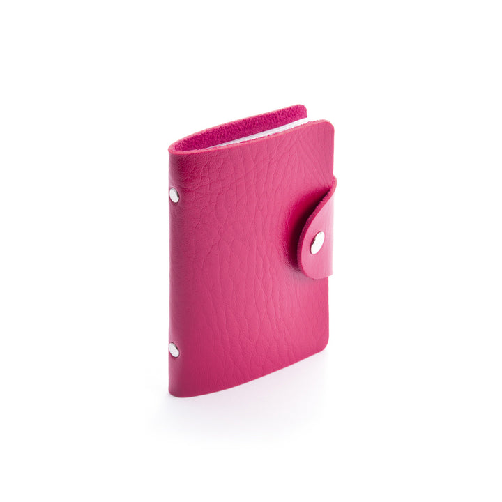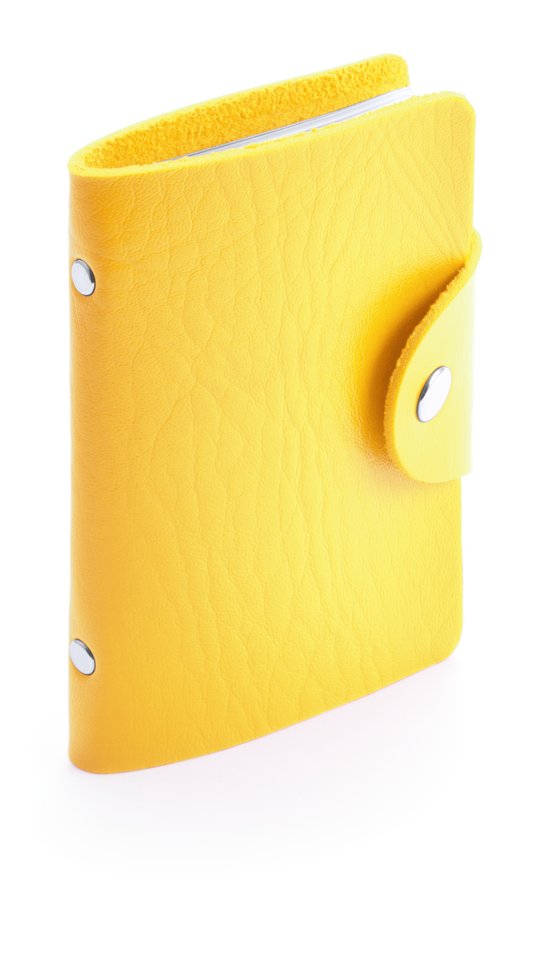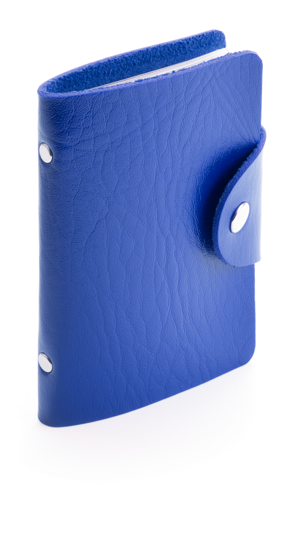 Kartenhalter aus weichem Kunstleder in auffälligen Farben mit Druckknopfverschluss aus Metall. Mit 10 Innenfächern aus resistentem, transparentem PVC und Metall-Verstärkungsnieten am Rücken.
