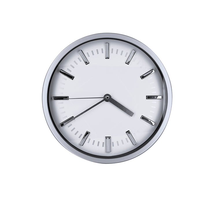 Wanduhr mit Aluminium- und Glasstruktur. Die Ziffern sind durch chromierte Stundensymbole und Viertel in Silber hervorzuheben und bieten einen stilvollen und funktionalen Look.Batteriebetrieb (1xAA nicht enthalten).