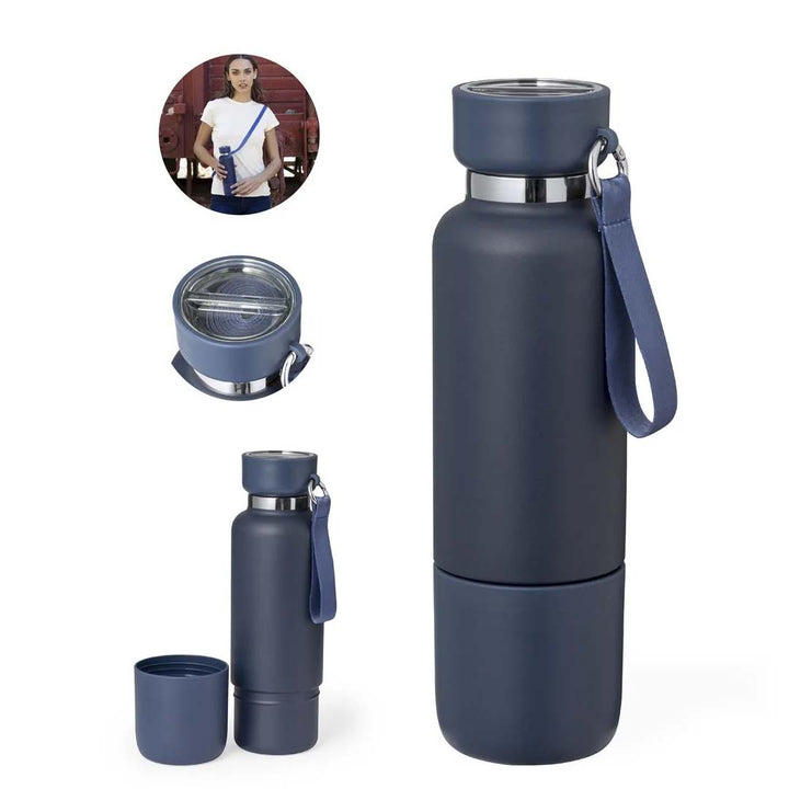 Der praktische Schraubverschluss garantiert eine auslaufsichere Aufbewahrung, während das integrierte Fach mit zwei austauschbaren Kordeln für zusätzlichen Komfort sorgt. Wählen Sie zwischen einem eleganten Armband oder einem praktischen Schlüsselband mit Karabinerhaken, um die Flasche sicher und einfach zu tragen. Der Boden der Flasche ist mit einem 300 ml Becher ausgestattet, der ebenfalls mit einem Schraubverschluss versehen ist und aus robustem PP (Polypropylen) besteht.