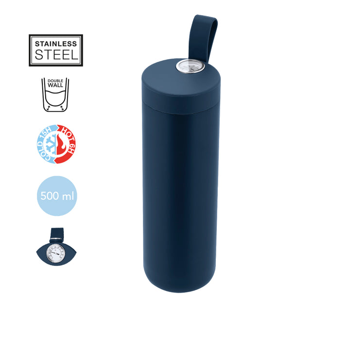 Thermobecher aus Edelstahl mit doppelter Wand und einer Kapazität von 500 ml mit analogem Temperaturmessgerät im Bereich von 0º bis 100º. Mit Sicherheitsverschluss, integriertem Silikon-Griff und passendem Gehäuse. BPA-frei.