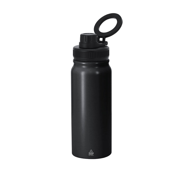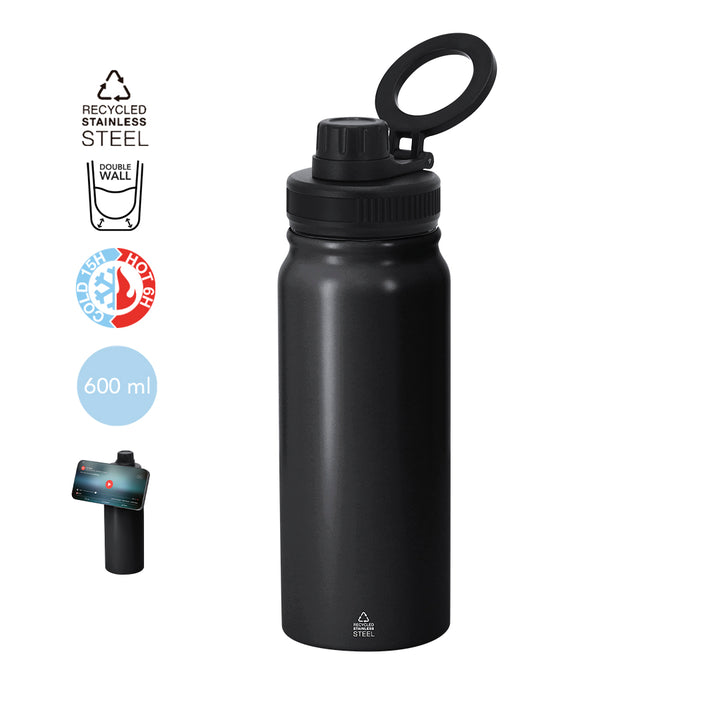 Thermoflasche mit 600 ml Kapazität, hergestellt aus recyceltem Edelstahl mit doppelter Wand. Mit drehbarem Magnetständer für Smartphone. BPA-frei. Mit dem Markenzeichen recycelter Edelstahl.Edelstahl ist eines der gefragtesten Materialien und kann fast überall gefunden werden, von Alltagsprodukten bis hin zu großen Konstruktionen. Mit unzähligen Eigenschaften, darunter Haltbarkeit und ein hohes Maß an Wiederverwendbarkeit, macht es zu einer geschätzten Alternative in nachhaltigen Lösungen. Richtig behandelt, ermöglicht es die Gewinnung neuer Ressourcen mit unendlichen Nutzungsmöglichkeiten.