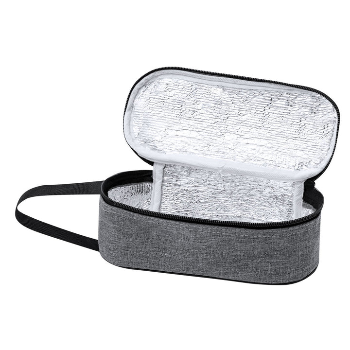 Thermo-Snackbox aus RPET 600D außen und isolierendem Aluminium innen. Mit Reißverschluss und Trageschlaufe. RPET-Label auf dem Etikett.Das RPET-Material wird aus recyceltem Kunststoff hergestellt, um die Wiederverwendung von Kunststoffabfällen zu fördern und zur Nachhaltigkeit des Planeten beizutragen.
