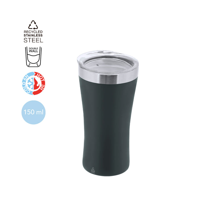 Thermobecher aus recyceltem Edelstahl mit doppelter Wand und 150 ml Fassungsvermögen. Äußeres in satiniertem Finish und inneres in Stahlfinish. Enthält einen transparenten Druckverschluss mit Dosierer, BPA-frei. Ideal für Ihren Schreibtisch, Tisch oder jede Oberfläche, um ruhig Ihr Lieblingsgetränk zu genießen. Mit Logo für recycelten Edelstahl.Stahl ist eines der am meisten nachgefragten Materialien, das nahezu überall zu finden ist, von täglichen Gebrauchsgegenständen bis hin zu großen Bauprojekten. Mit unzähligen Eigenschaften, darunter Langlebigkeit und ein hoher Grad an Wiederverwendbarkeit, macht ihn zu einer sehr geschätzten Alternative in nachhaltigen Lösungen. Richtig behandelt, ermöglicht es neue Ressourcen von unbegrenztem Nutzen zu erhalten.