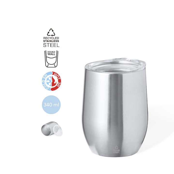 - Eigenschaften: Doppelwandige Isolierung, transparenter Deckel mit Schnappverschluss und Spender, Recycled Stainless Steel-Logo