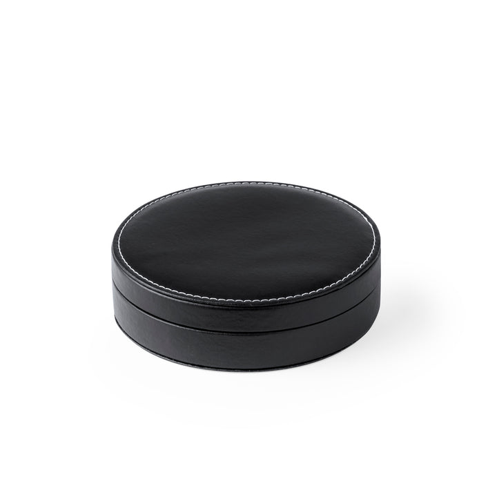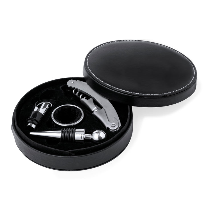 Weinset mit elegantem, rundem Design aus PU-Leder und Zubehör aus Edelstahl. Inklusive 2-Hebel-Korkenzieher mit Kapselschneider, Stopfen, Dosierer und Tropfstopper.