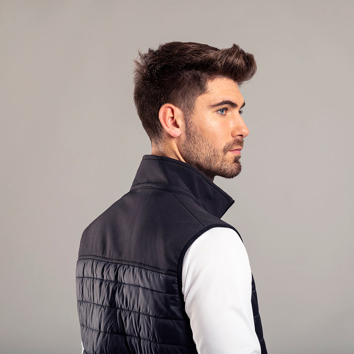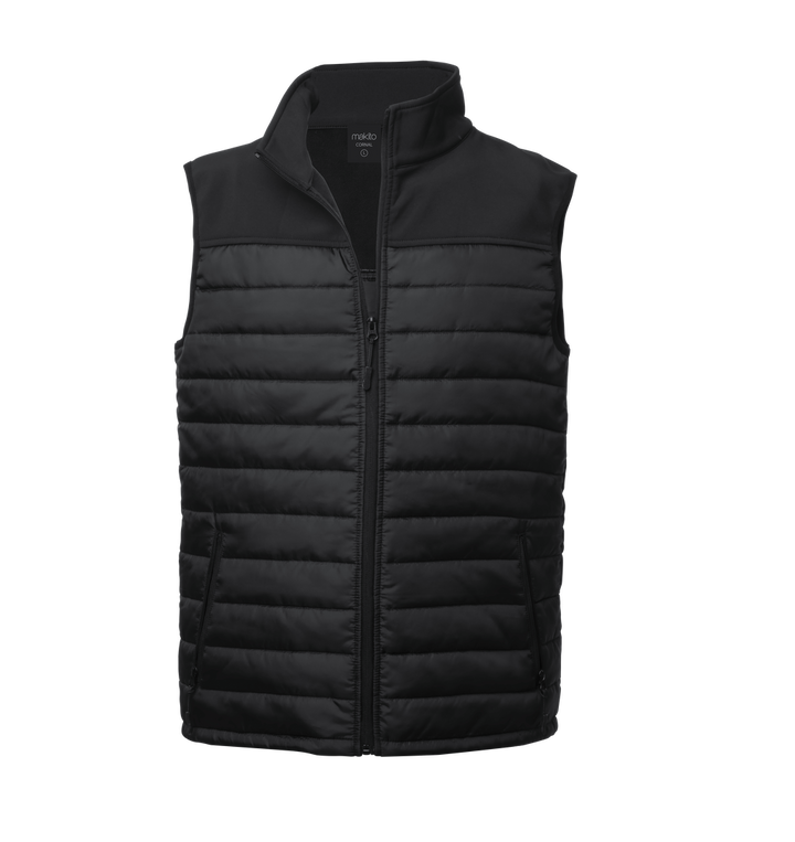 Wasserdichte und atmungsaktive Weste in Kombination aus Softshell- und Polyestermaterialien. In eleganter schwarzer Farbkonstruktion, mit Reißverschluss und seitlichen Reißverschlusstaschen, mit Pullern zum einfachen Öffnen. Erhältlich in den Größen S, M, L, XL, XXL.