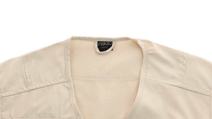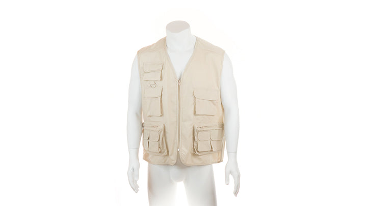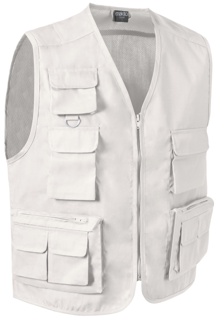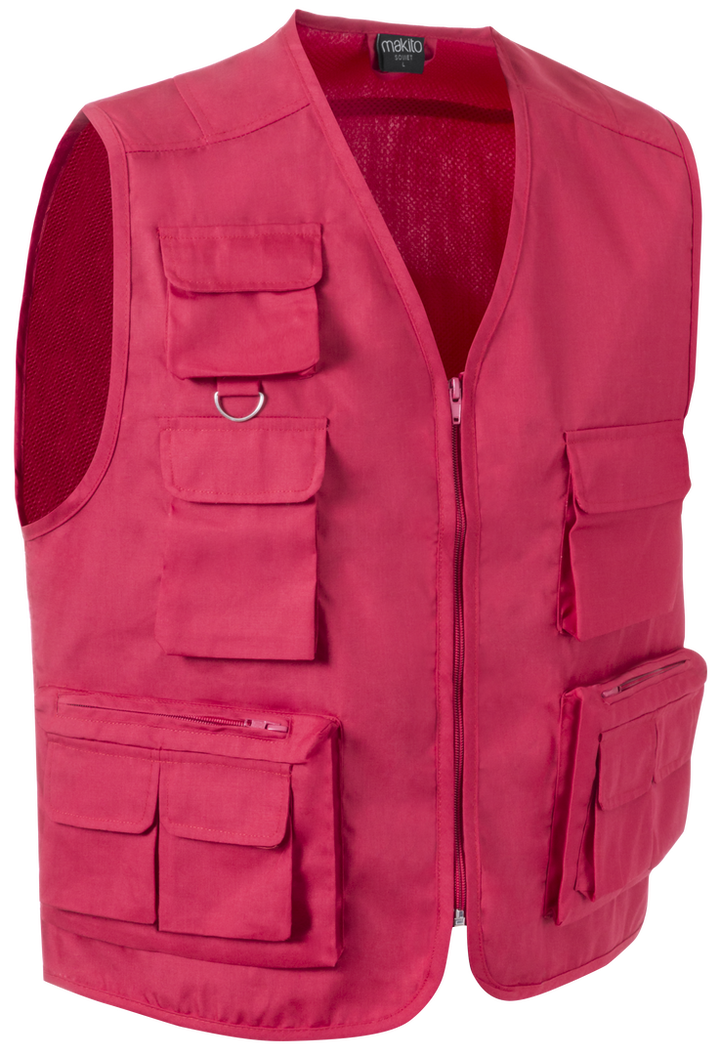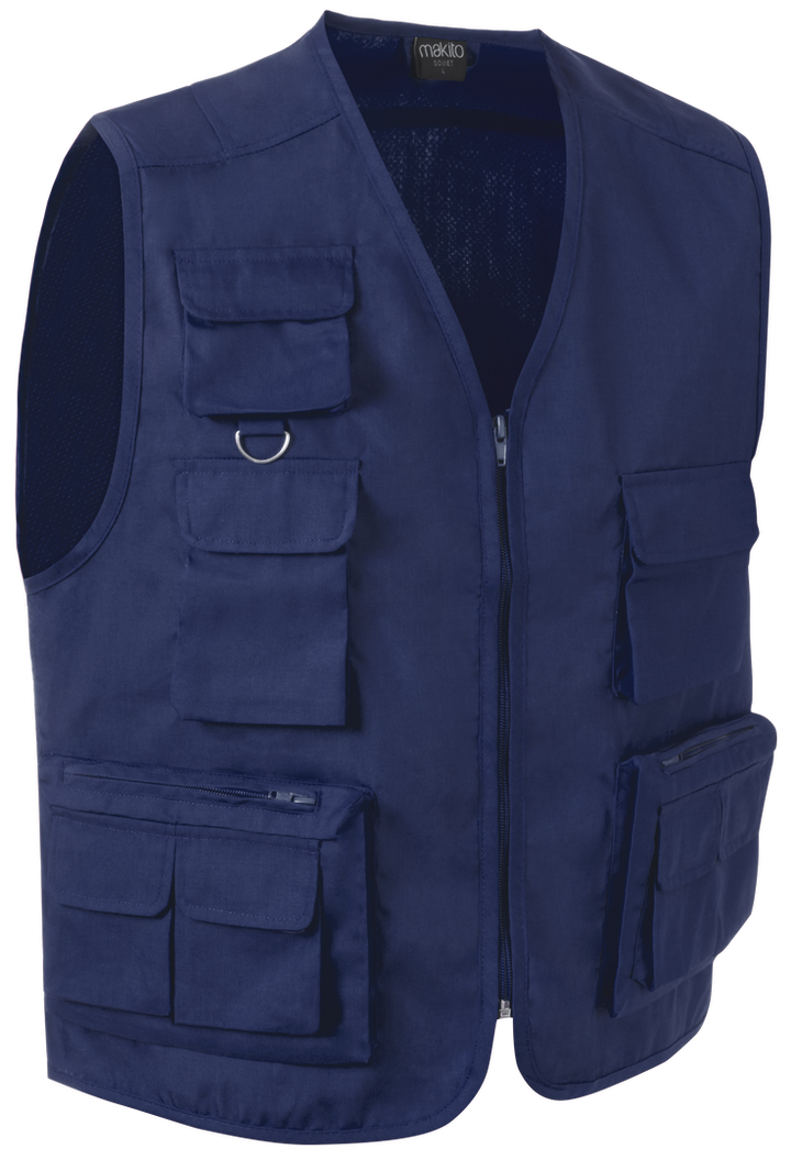 Weste aus einer resistenten Baumwoll/Polyester-Kombination in kräftigen Farben. Mit Reißverschluss, mehreren Vorder- und Seitentaschen mit großem Fassungsvermögen und Klettverschluss sowie Metallring auf der Brust. Erhältlich in den Größen L, XL und XXL.