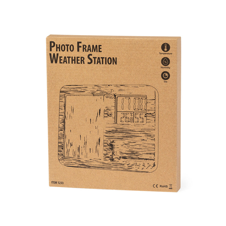 Linie "Natur" Fotorahmen aus poliertem Bambus, mit integrierter Wetterstation und den Funktionen Thermometer, Hygrometer und Uhr. Geeignet für Fotos im Format 9x14cm und mit batteriebetriebener Uhr (Knopfzellen enthalten). Präsentiert in einer attraktiven Öko-Design-Box. Gebrauchsanweisung in Englisch und Spanisch erhältlich.