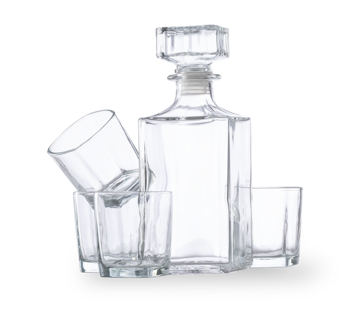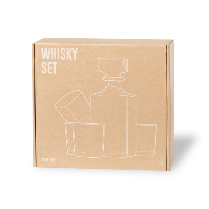 Whiskyset mit schlichtem Design und aus Glas. Enthält 4 Gläser von 200 ml und 1 l Dekanter, mit Glasstopfen. Präsentiert in einer individuellen Kraft-Design-Box.